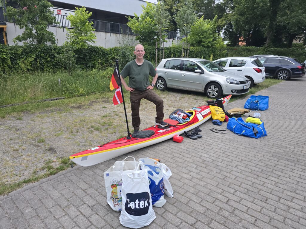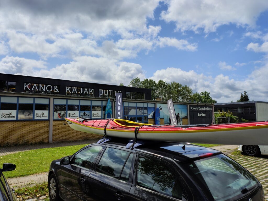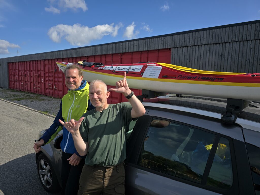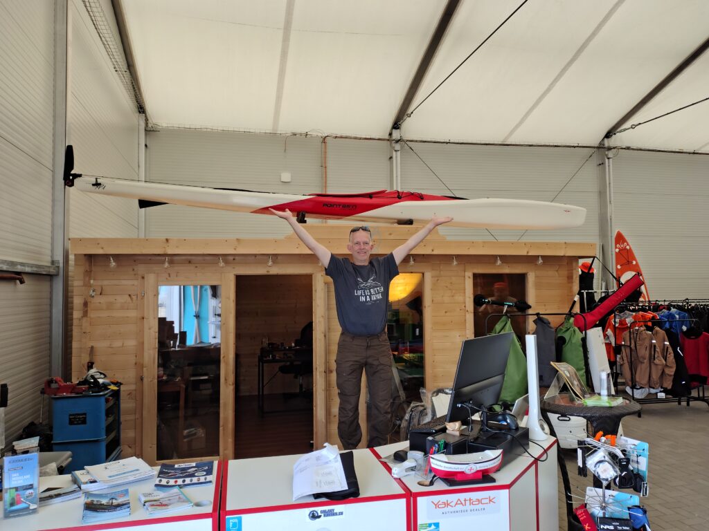 I formiddags var vi ved Kajakprofi.de hvor jeg skulle have et par ro-shorts. De havde et par der passede godt. Så vi var sådan set færdige efter 10 minutter, men vi skulle jo lige se det hele, det kunne jo være der var noget vi manglede! Så fik jeg øje på en kajak der sad sådan almindelige dødelige ikke kunne nå den. Det viste sig at være en Point 65 prototype for Freja Hoffmeister. Hvis i ikke ved hvem det er, så er hun fra Kiel og har roet rundt om Australien, Sydamerika, og er i gang med Nordamerika. Jeg fik da lov til lige at løfte den op, det er selvfølgelig AI som ikke fik placeret mine hænder rigtig!