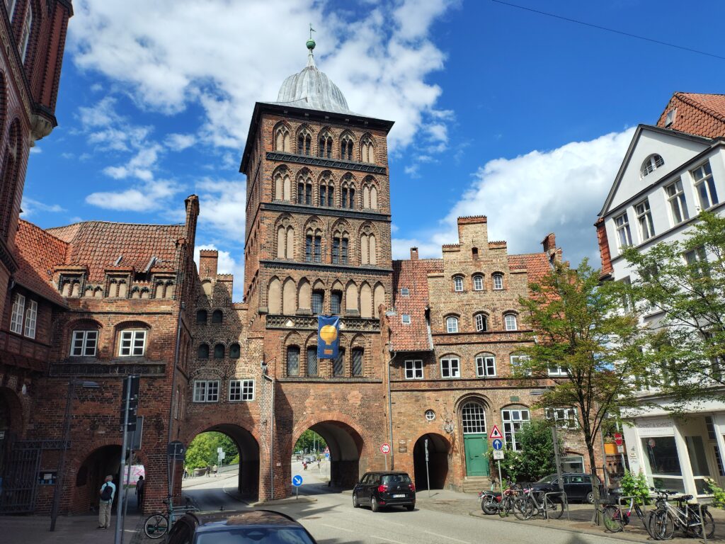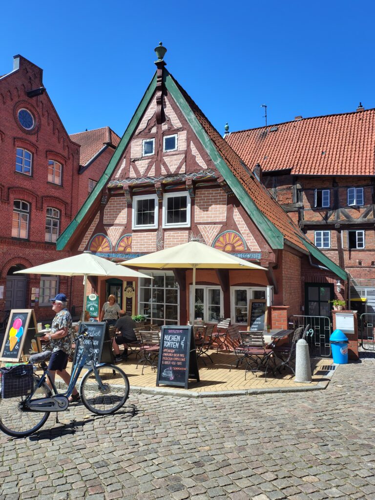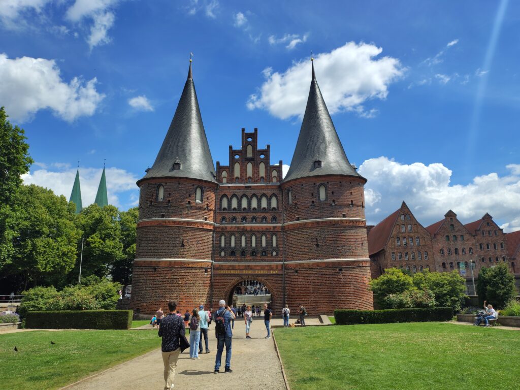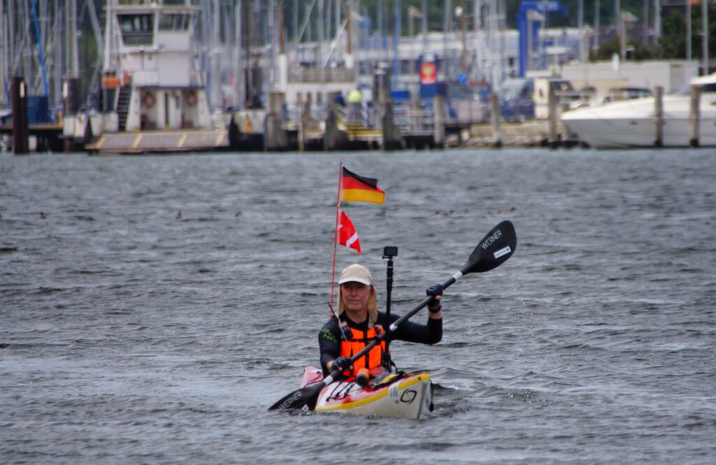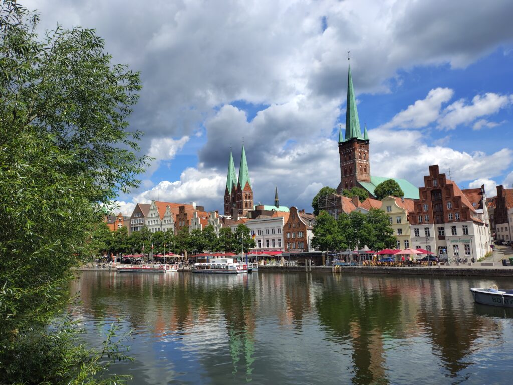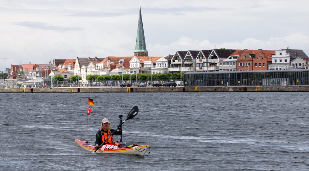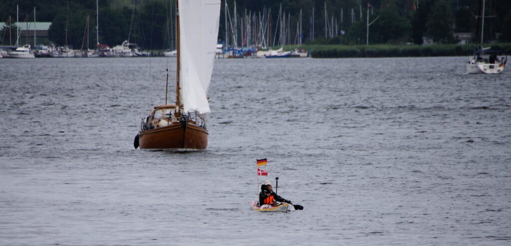 Da jeg kørte kajakken ud på broen, kom en gut gående med kajak, og jeg spurgte kækt “Skal du med til Travemünde?” Det viste sig han ville et stykke af vejen og så vende om igen. Det var Marc, den første på turen som jeg roede en længere strækning med, og det var rigtig hyggeligt. Vi fik snakket om lidt af hvert og solen skinnede sådan halvt i hvert fald. Turen førte halvvejs rundt om den gamle bykerne, vi kom forbi en replica af en kogge, båden som hanse’n benyttede sig af i stor stil. Tak for selskabet Marc, og godt du nåede at hente børnene 😀