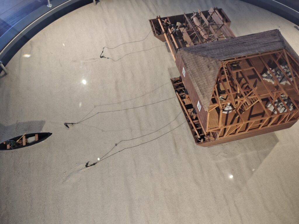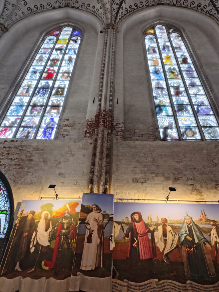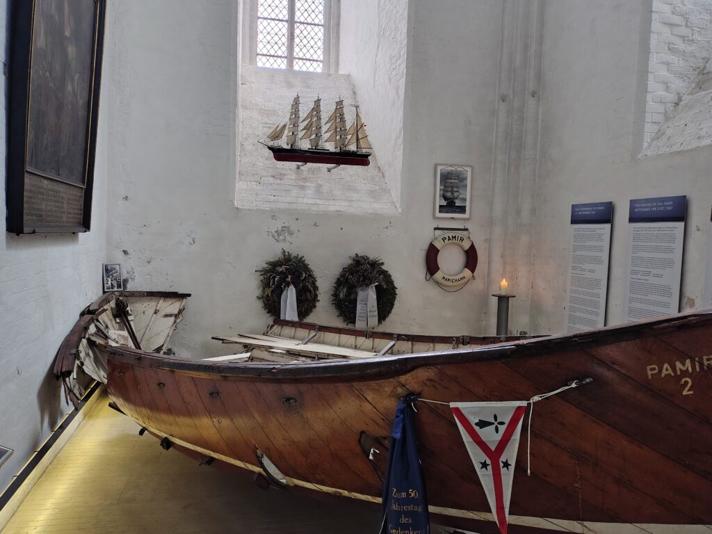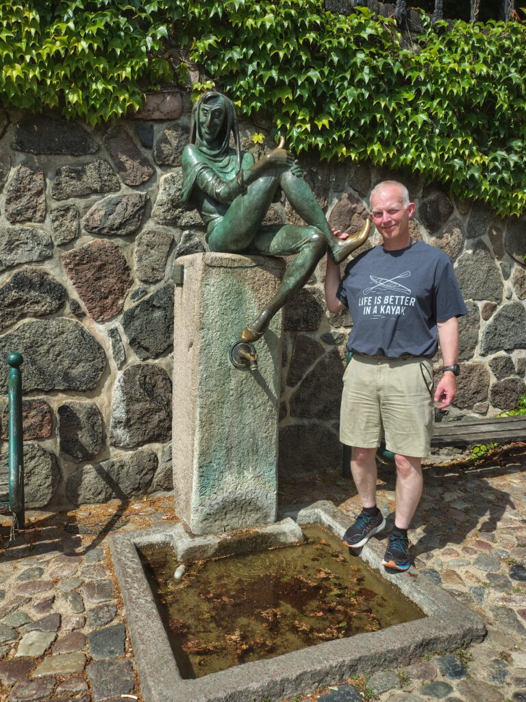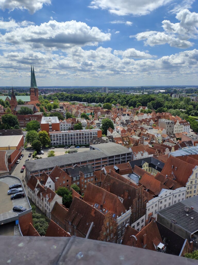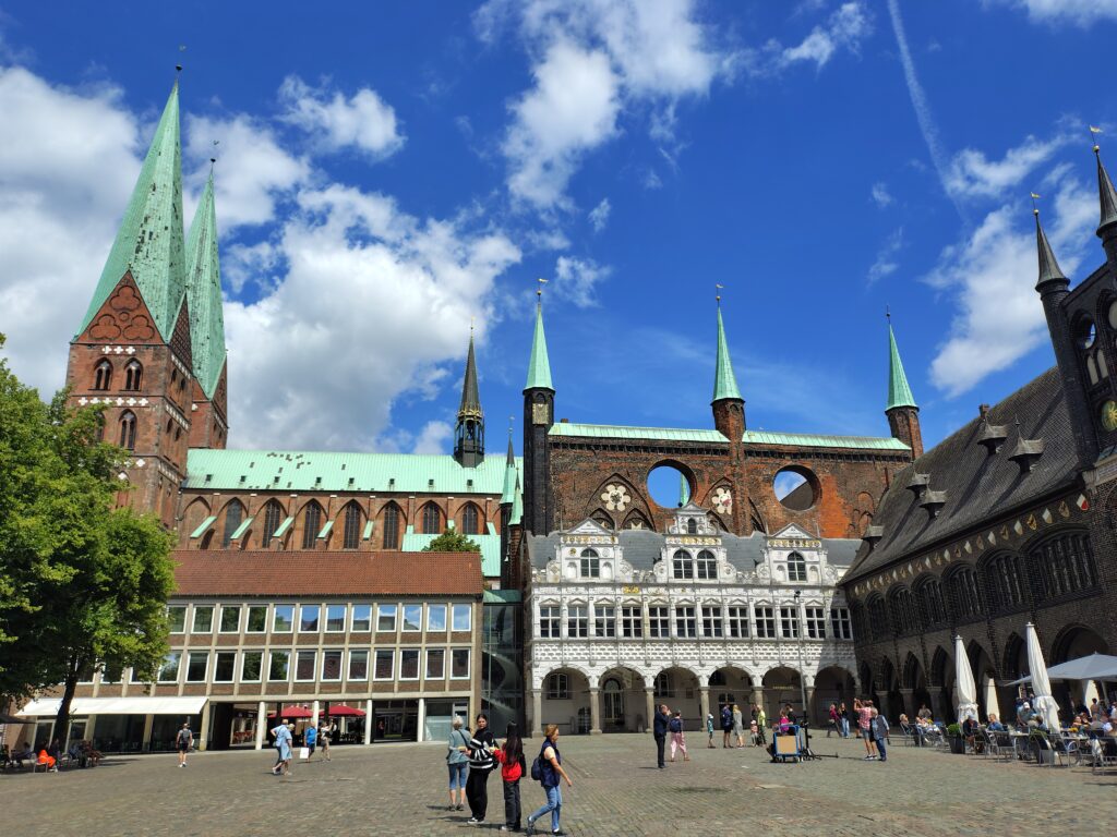 Da jeg kørte kajakken ud på broen, kom en gut gående med kajak, og jeg spurgte kækt “Skal du med til Travemünde?” Det viste sig han ville et stykke af vejen og så vende om igen. Det var Marc, den første på turen som jeg roede en længere strækning med, og det var rigtig hyggeligt. Vi fik snakket om lidt af hvert og solen skinnede sådan halvt i hvert fald. Turen førte halvvejs rundt om den gamle bykerne, vi kom forbi en replica af en kogge, båden som hanse’n benyttede sig af i stor stil. Tak for selskabet Marc, og godt du nåede at hente børnene 😀