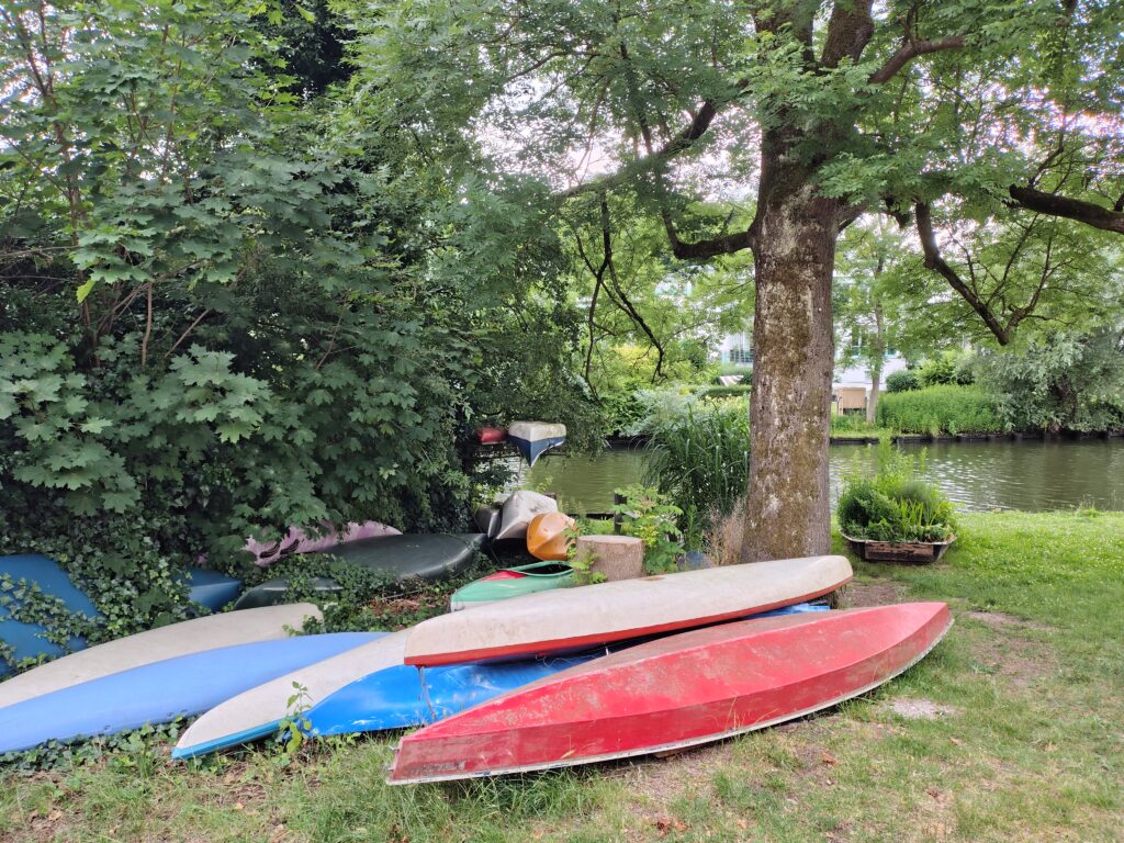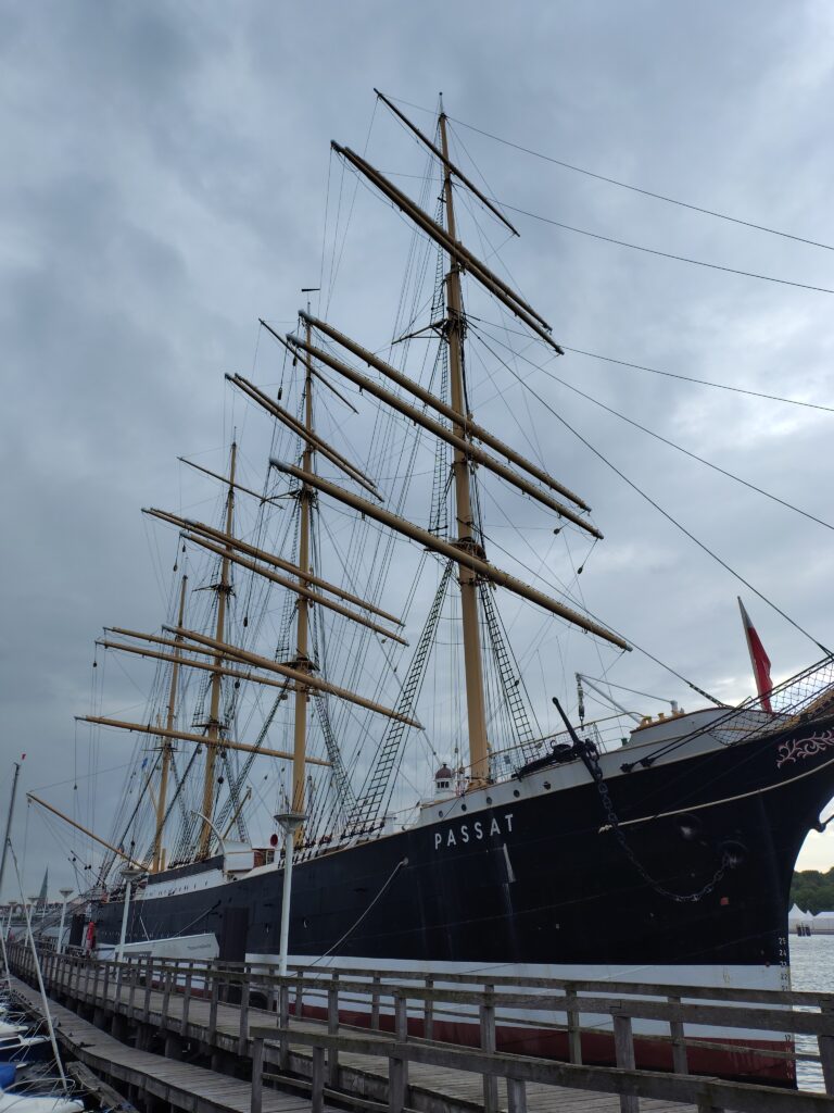 Overnatningsstedet er en lille trekantet grund lige ved indsejlingen til havnen, som tilhører Verein für Kanusport Lübeck. Klubskuret har udsigt mod det gamle skoleskib Passat, som er søsterskibet til den forulykkede Pamir, som jeg tidligere viste redningsbåden af. Imponerende og flot båd.